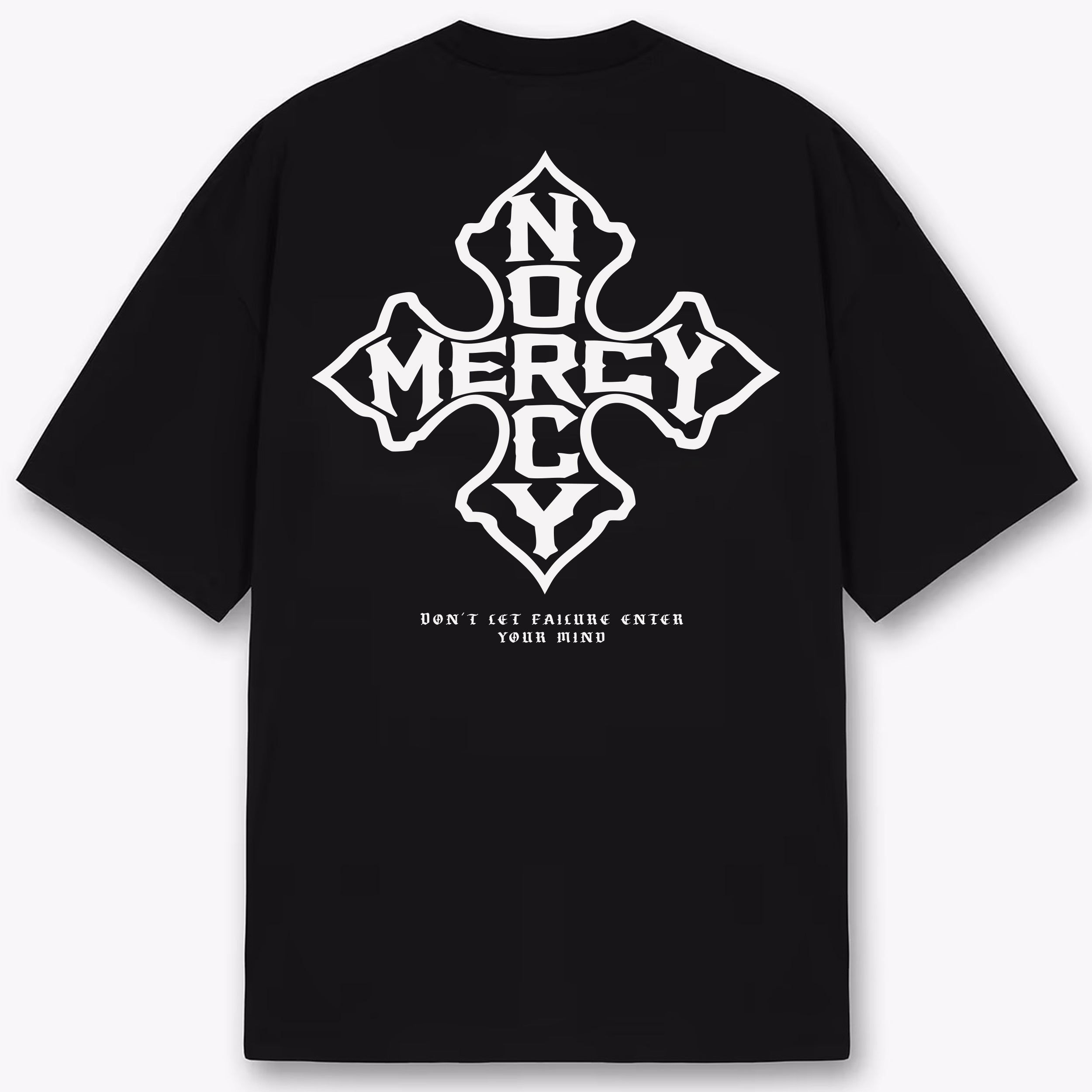 The front features the clean No Mercy Iron Cross emblem, a bold symbol of resilience, discipline, and the uncompromising mindset behind the brand. On the back, an oversized version of the graphic makes a powerful statement, finished with the message “Don’t Let Failure Enter Your Mind.” A reminder that the real fight is always mental.