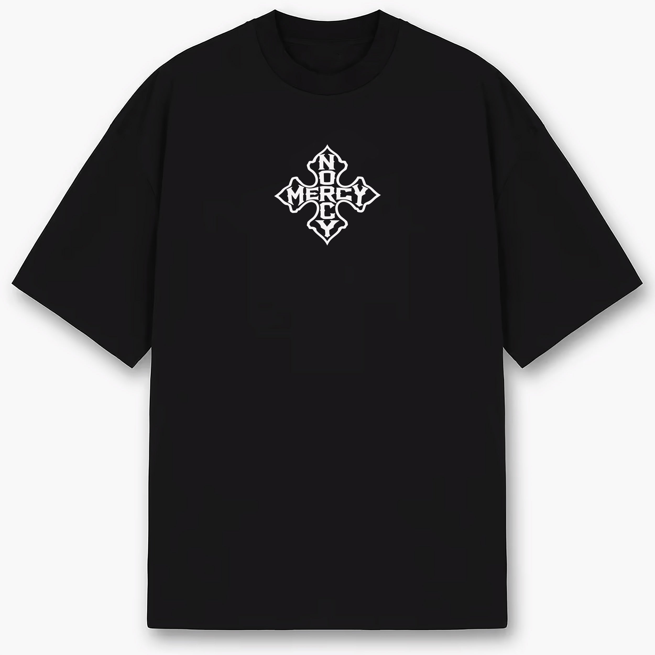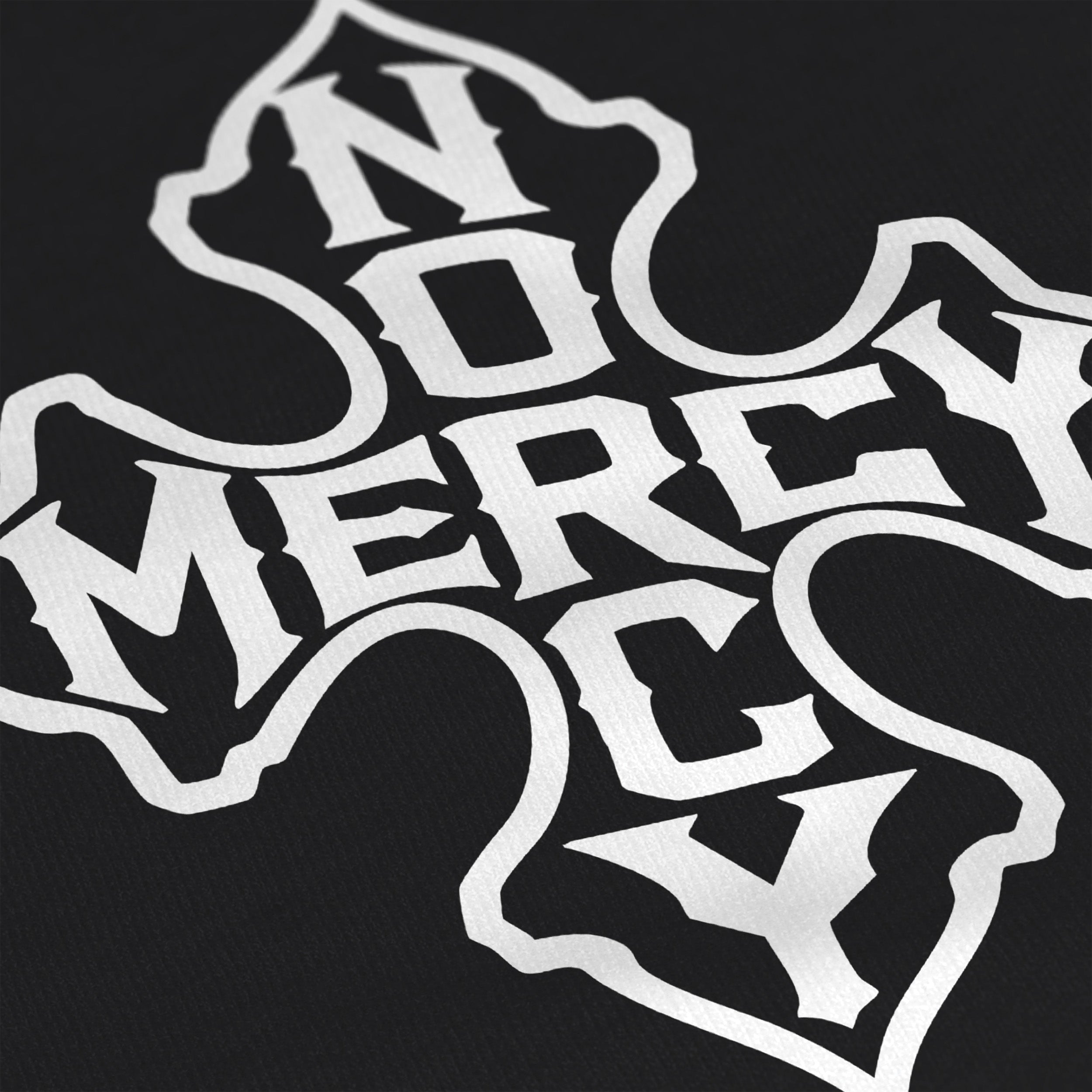 Front Print: No Mercy Iron Cross emblem on chest