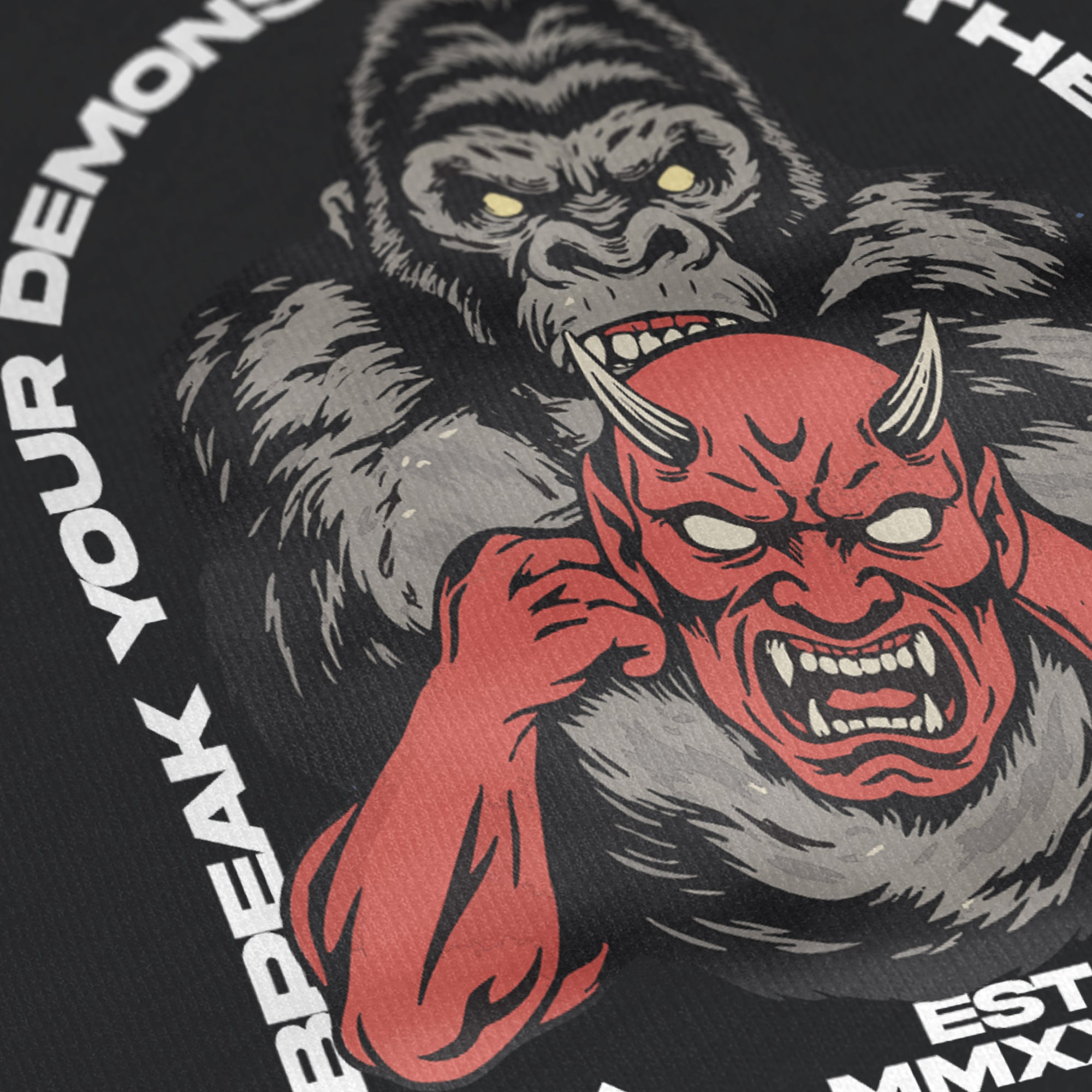 • Back Graphic: Gorilla choking the devil with “Break Your Demons Before They Break You” text