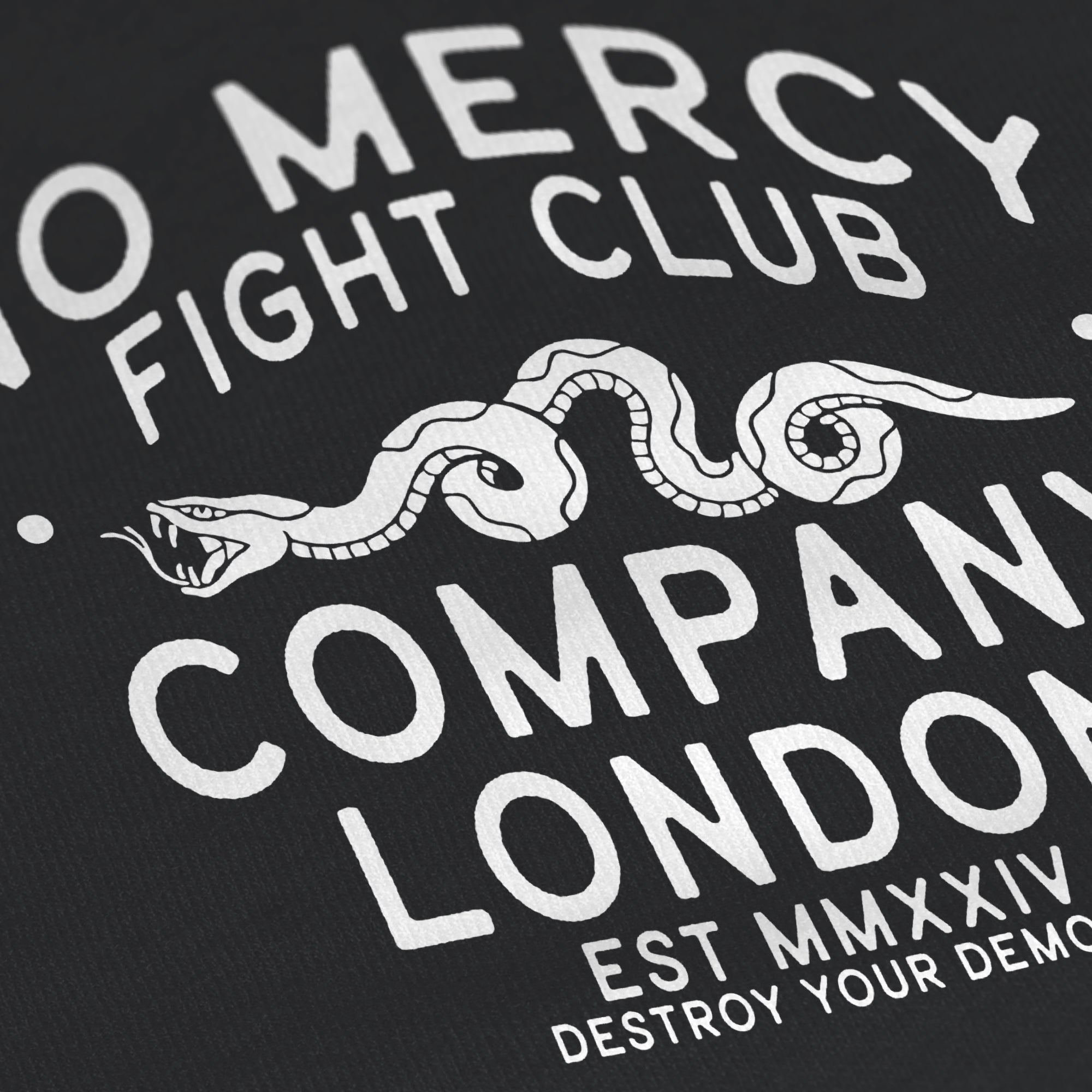 • Left Thigh Print: Snake illustration with “No Mercy Fight Club – Company London – EST MMXXIV – Destroy Your Demons”