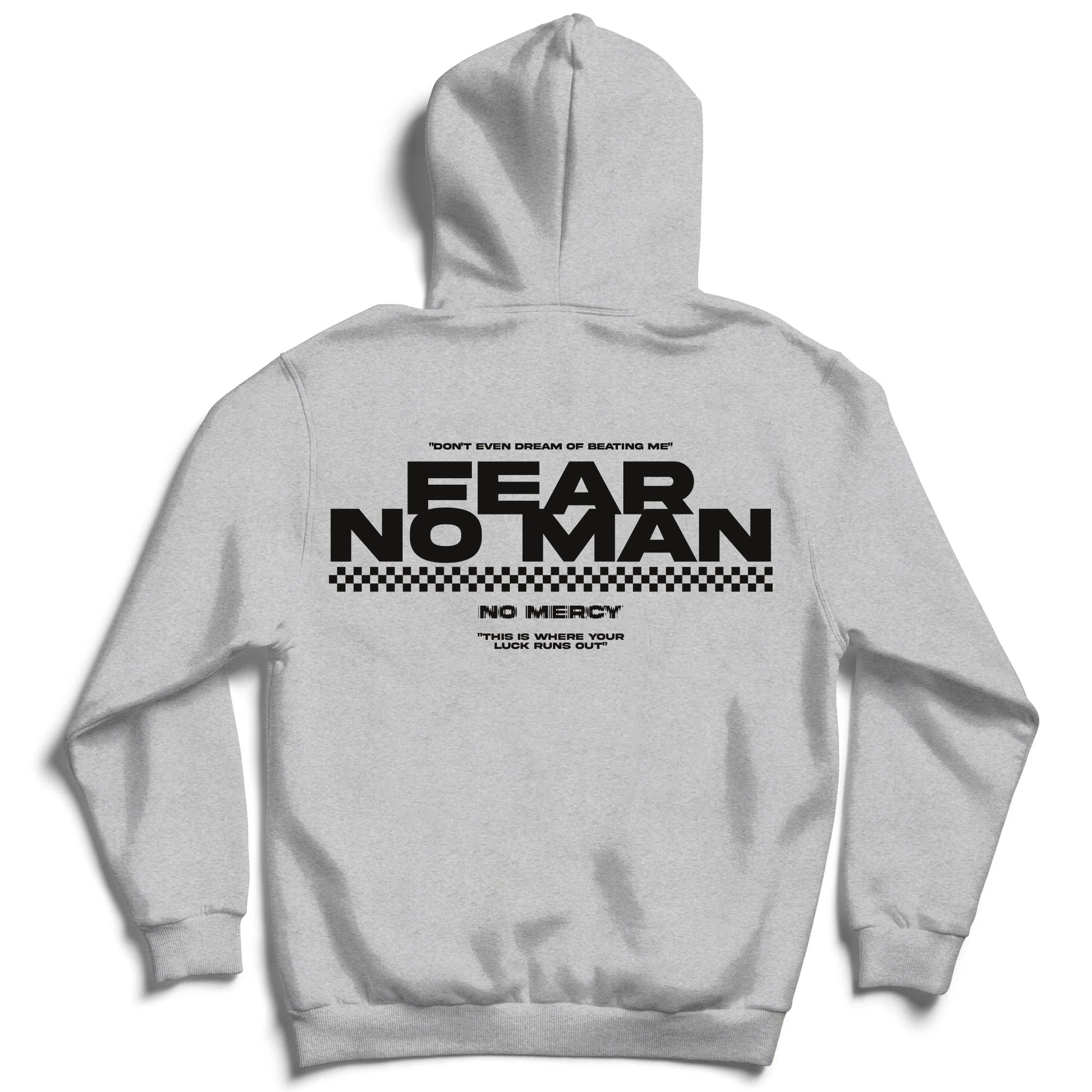 • Front Graphic: Bold black lettering + checkered pattern with “Fear No Man”