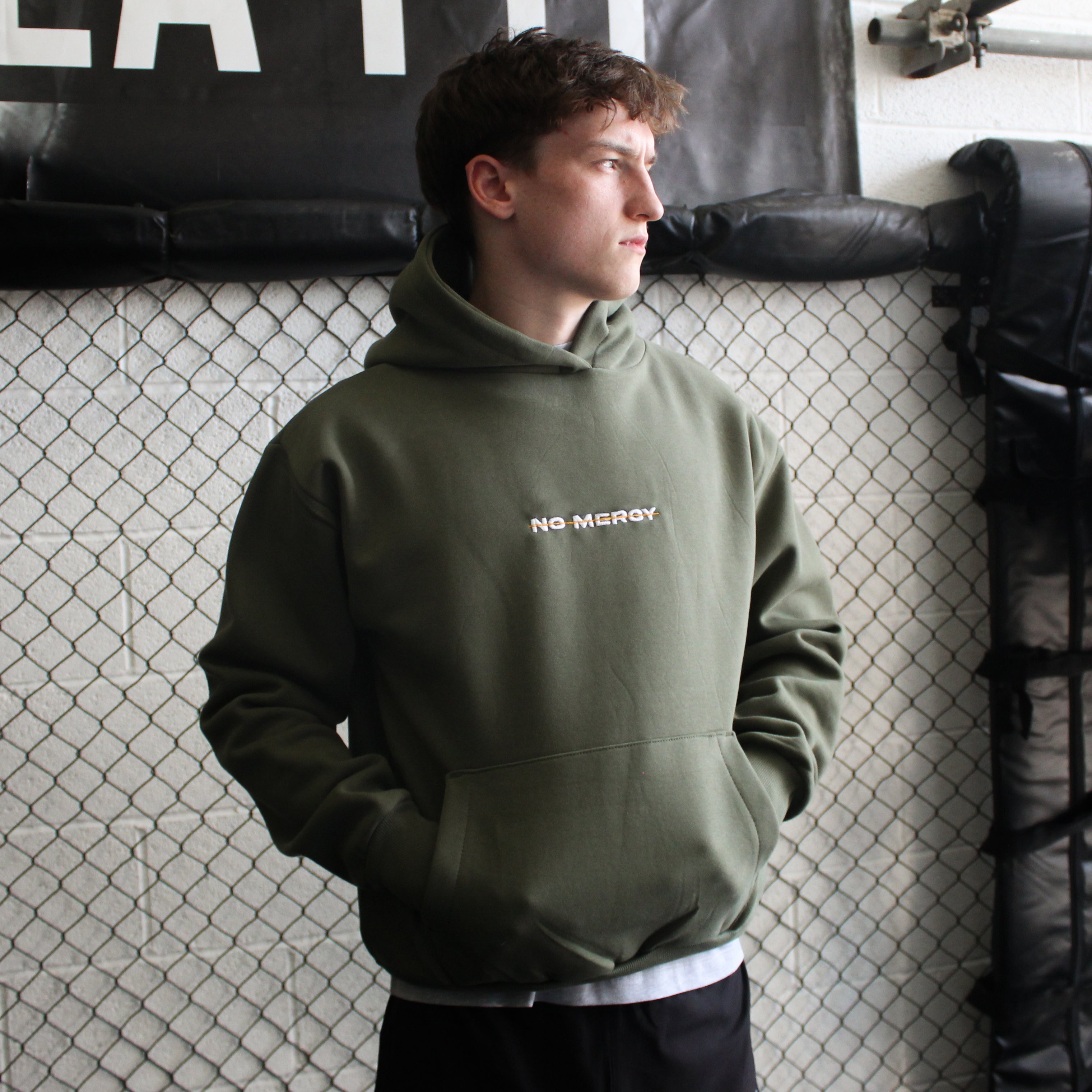 Introducing the No Mercy Hoodie in Dark Green, designed for those who embody strength and resilience. Crafted from premium heavyweight cotton, this hoodie offers a relaxed fit, providing comfort and warmth for those who push through every challenge. The No Mercy logo is embroidered on the front, adding a touch of refined detail while representing the mindset of warriors who never give up. With ribbed hem and cuffs for a snug fit and two hand pockets for convenience, this hoodie combines practicality with bold style. Built to last, it’s perfect for those who train hard and live with No Mercy.