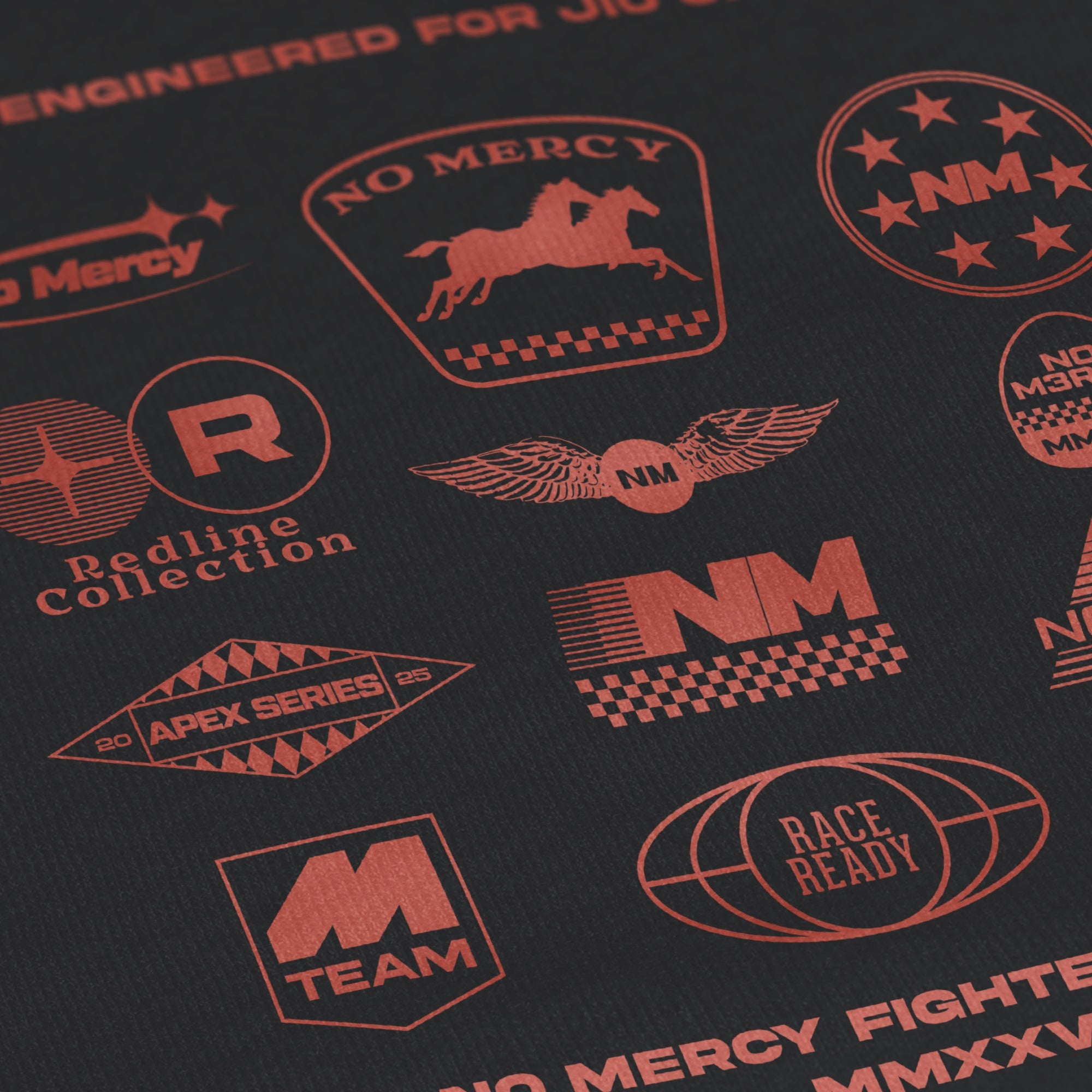 • Back Graphic: “Engineered for Combat” with red racing-inspired combat logos and “No Mercy Fighters Club” text