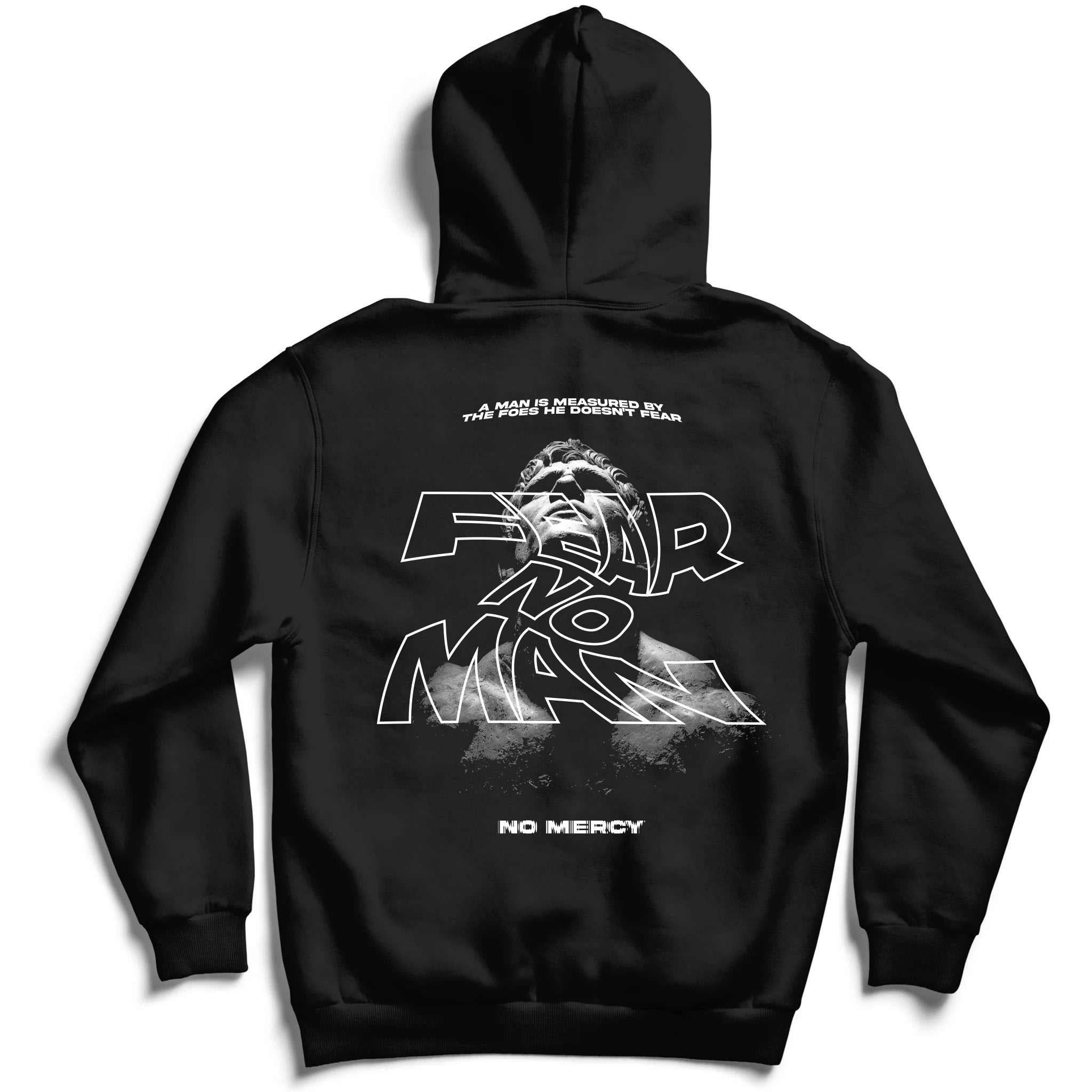 On the front chest, the same warrior figure appears again, smaller in scale, surrounded by the words Fear No Man, stamped with the No Mercy logo. A quiet reminder worn close to the heart: fear isn’t in your vocabulary.