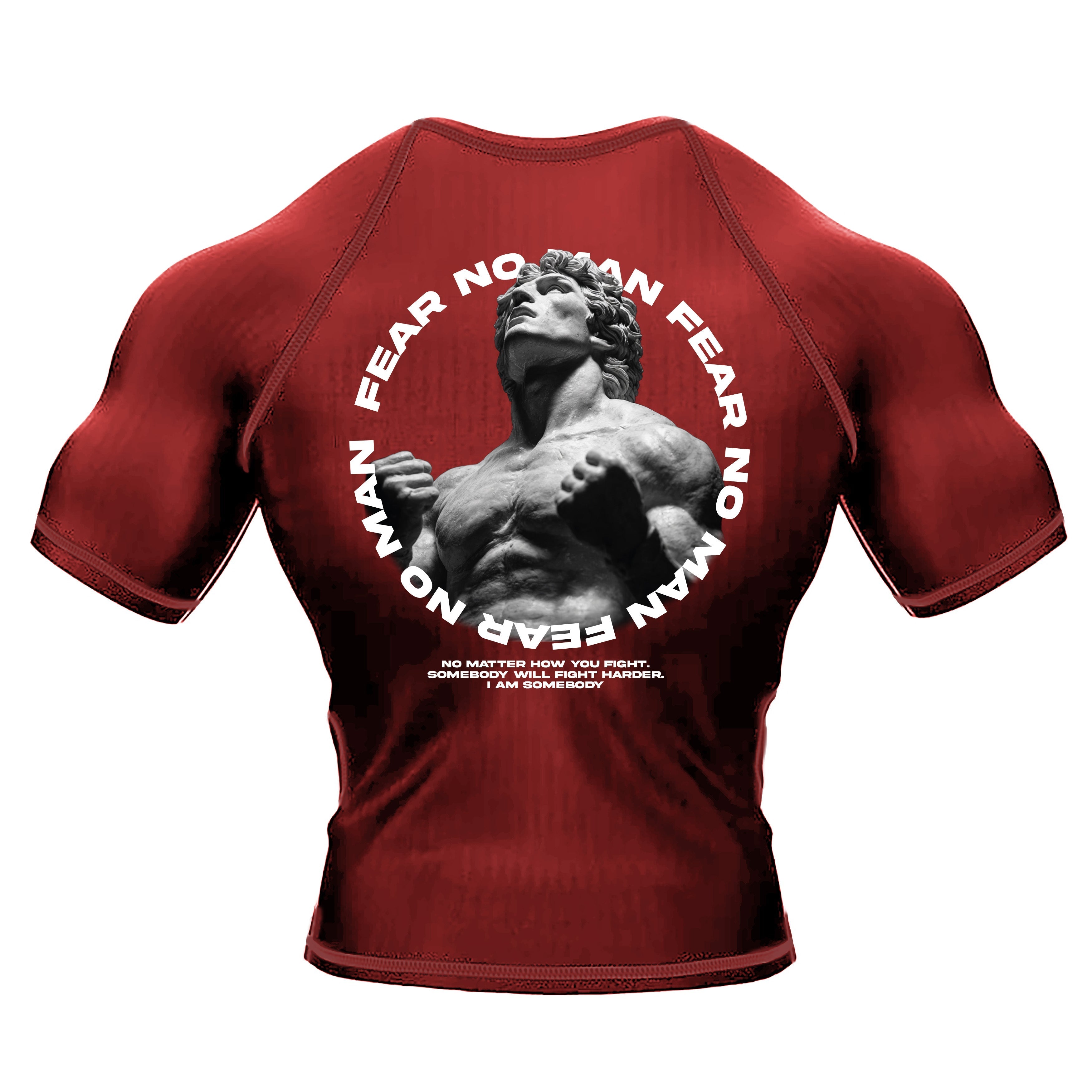 The Fear No Man edition of the No Mercy rash guard features a striking Roman statue-style design: a lone warrior poised to fight, sculpted in defiance, surrounded by the words FEAR NO MAN. Beneath him, a truth most won’t say out loud: