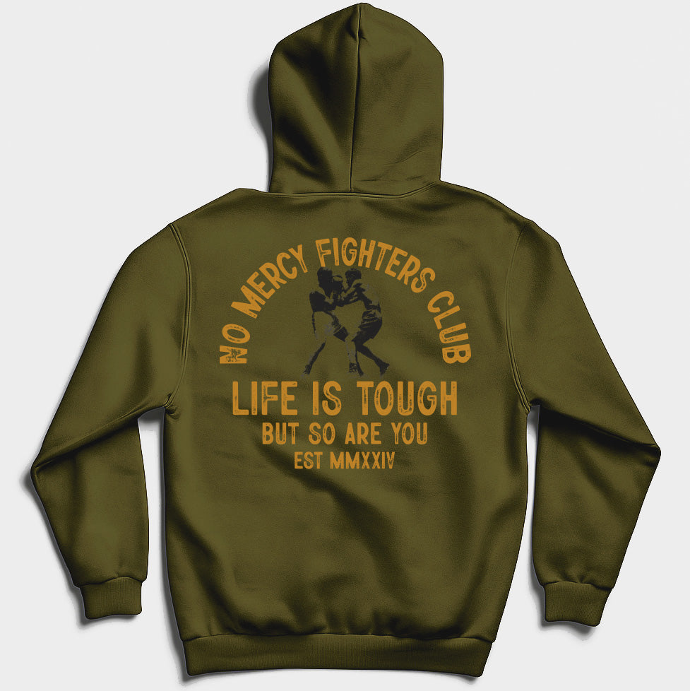 • Back Graphic: Yellow text “No Mercy Fighters Club – Life Is Tough, But So Are You – Est. MMXXIV” with black-and-white boxing image