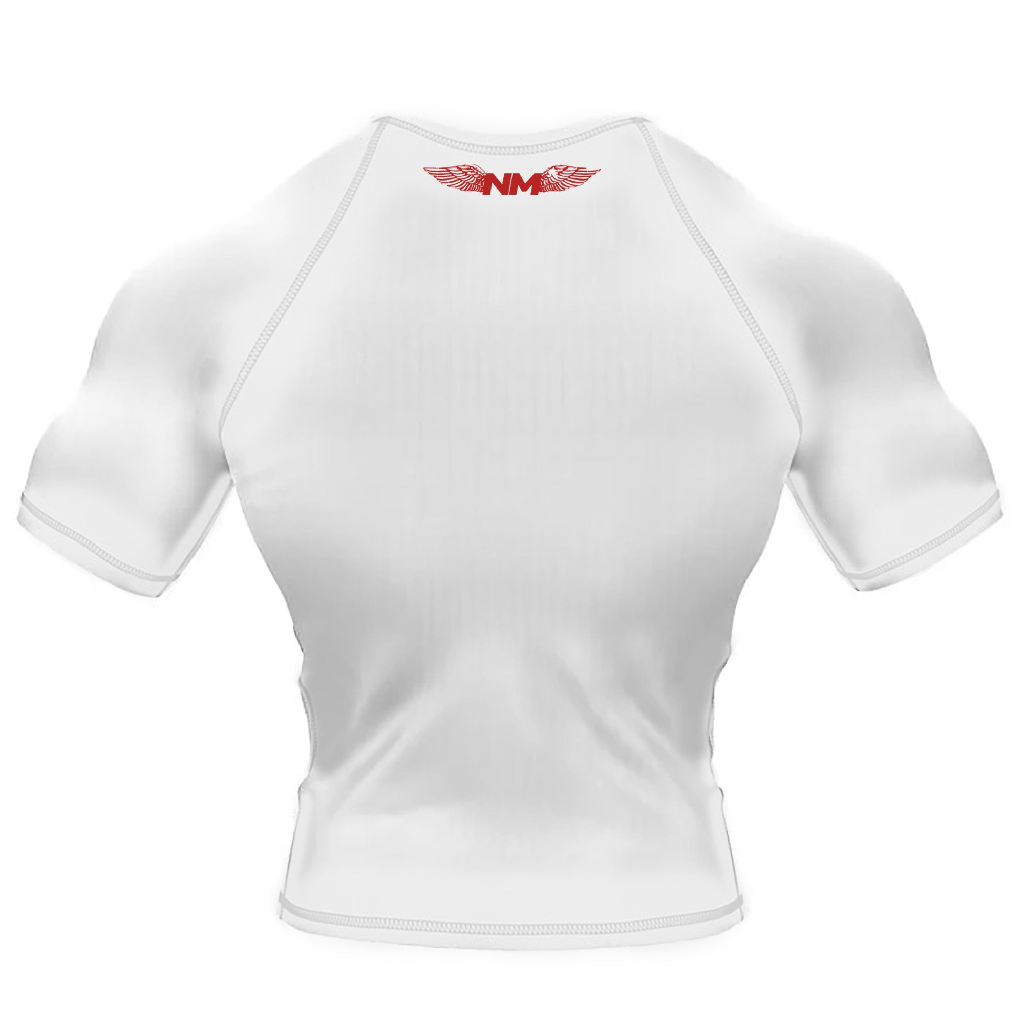 Speed meets submission. The No Mercy Performance Rash Guard is a tribute to those who fight like racers — calculated, relentless, and always pushing limits. With a crisp white base, this edition features a racing stripe design down the front right side, echoing the suit of the world-class drivers of the past. Flanked by a grid of sponsor-style logos, giving the look of elite-level team apparel.