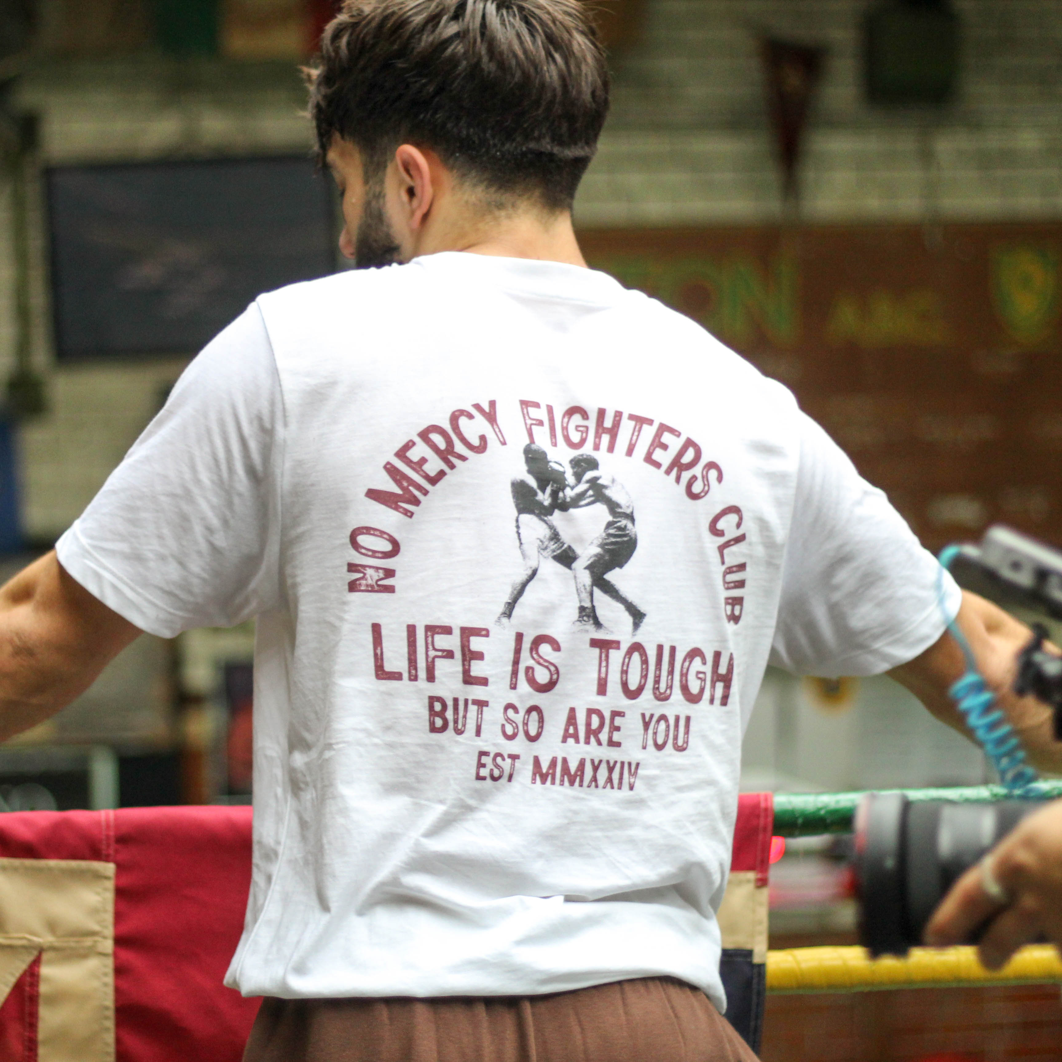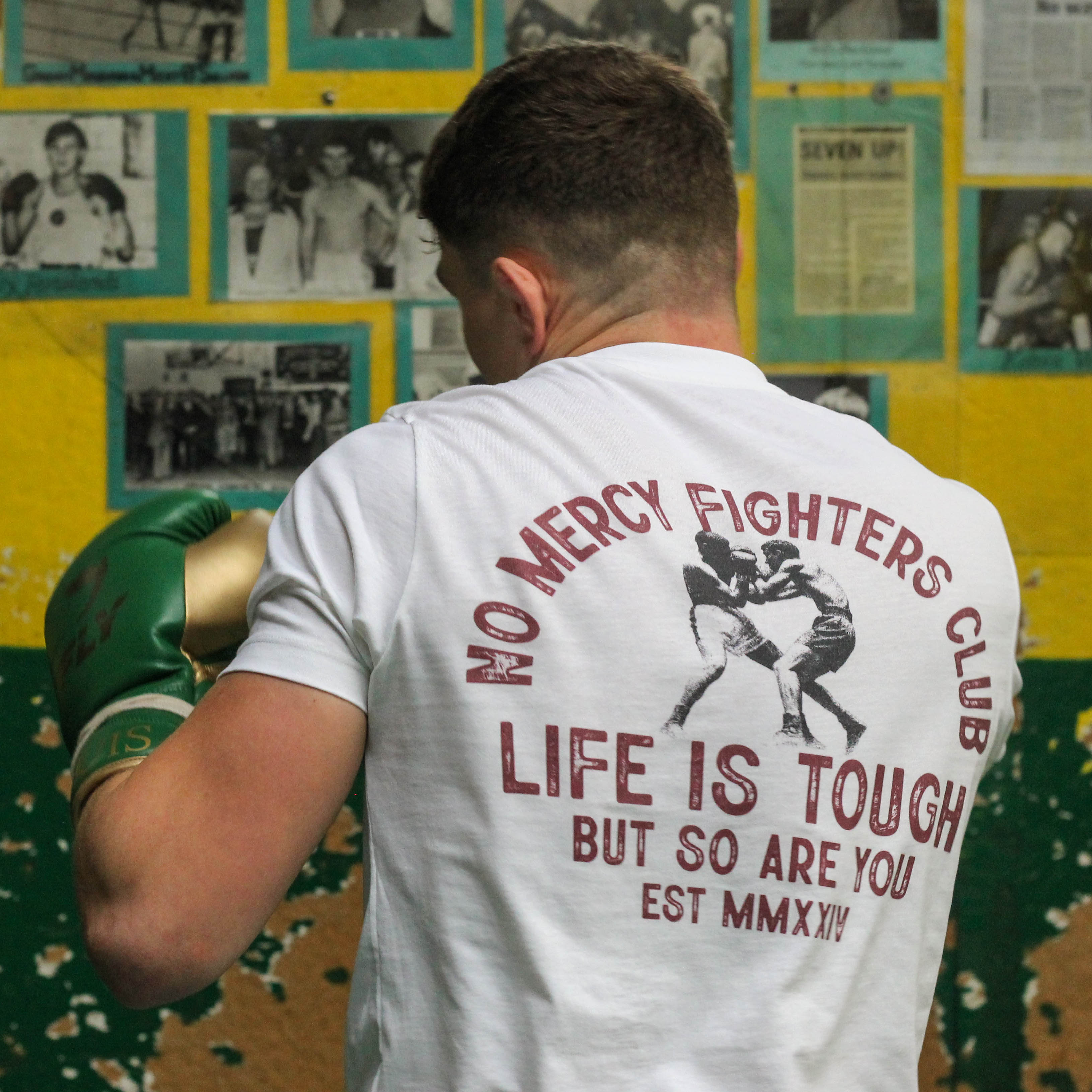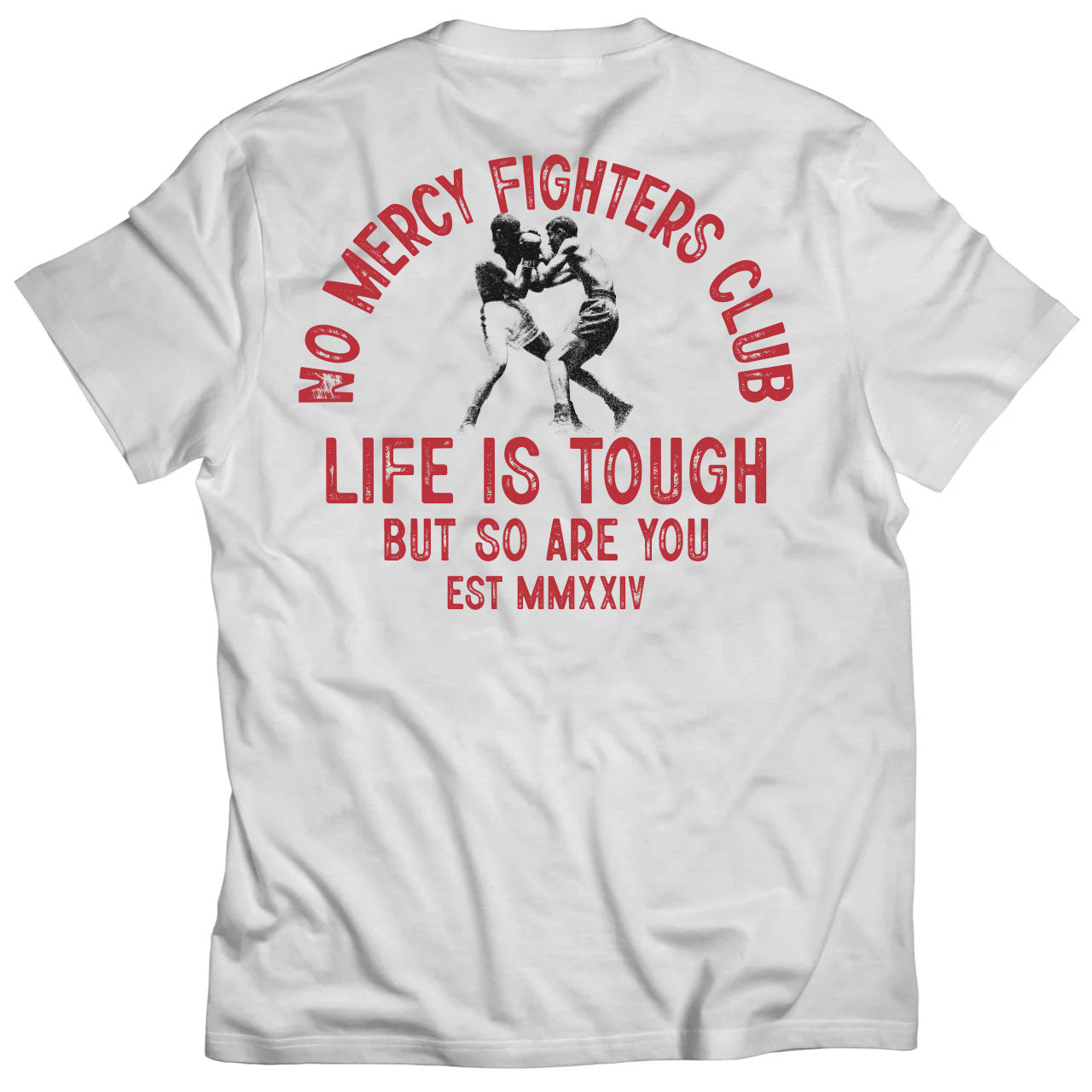 • Back Graphic: Red text — “No Mercy Fighters Club / Life Is Tough, But So Are You / Est. MMXXIV” — with black & white boxing image