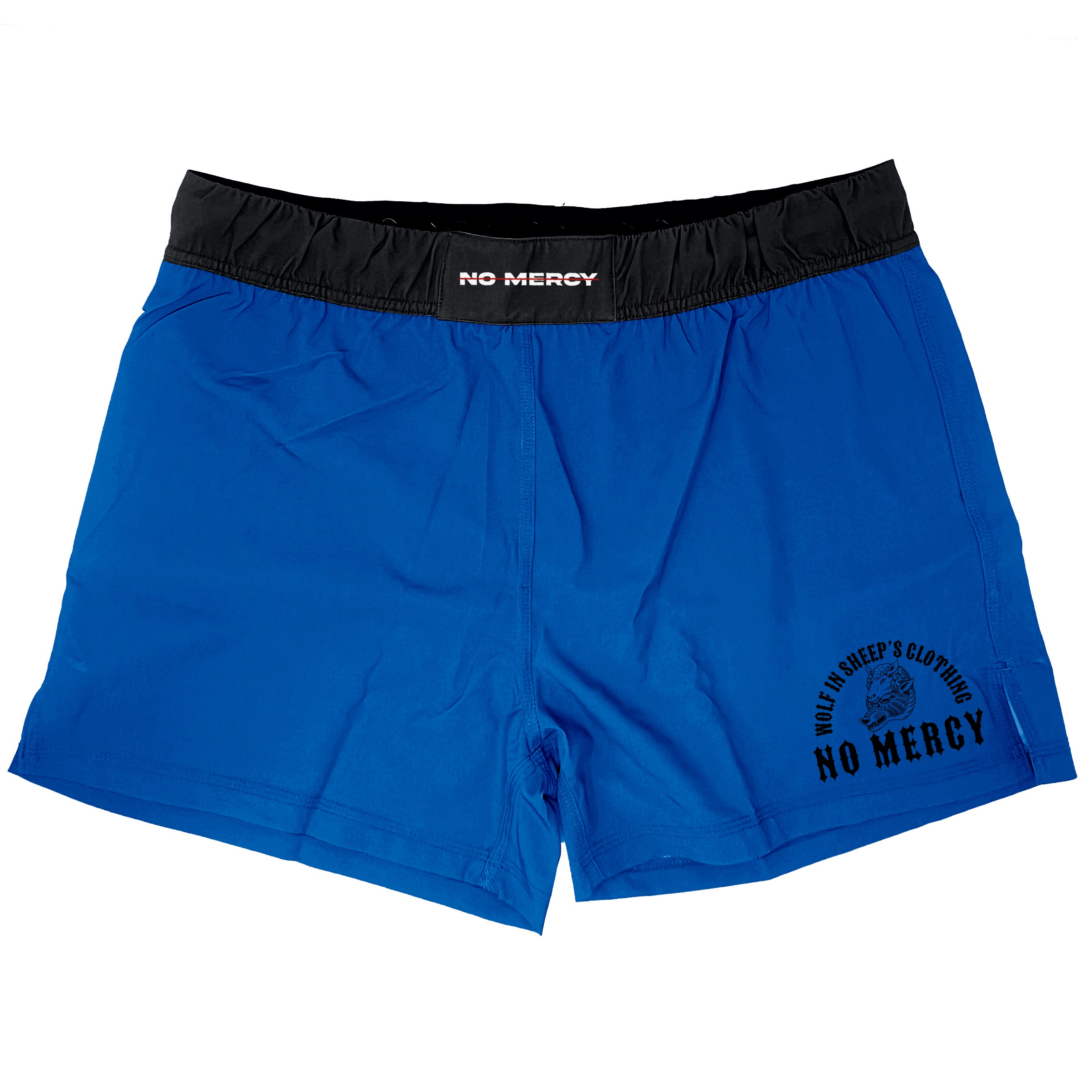 Across the waistband, the striking No Mercy branding locks in the message: these shorts aren’t made for comfort, they’re made for battle. Clean in design but heavy in meaning, the blue base with black print creates a powerful presence in training and competition alike.